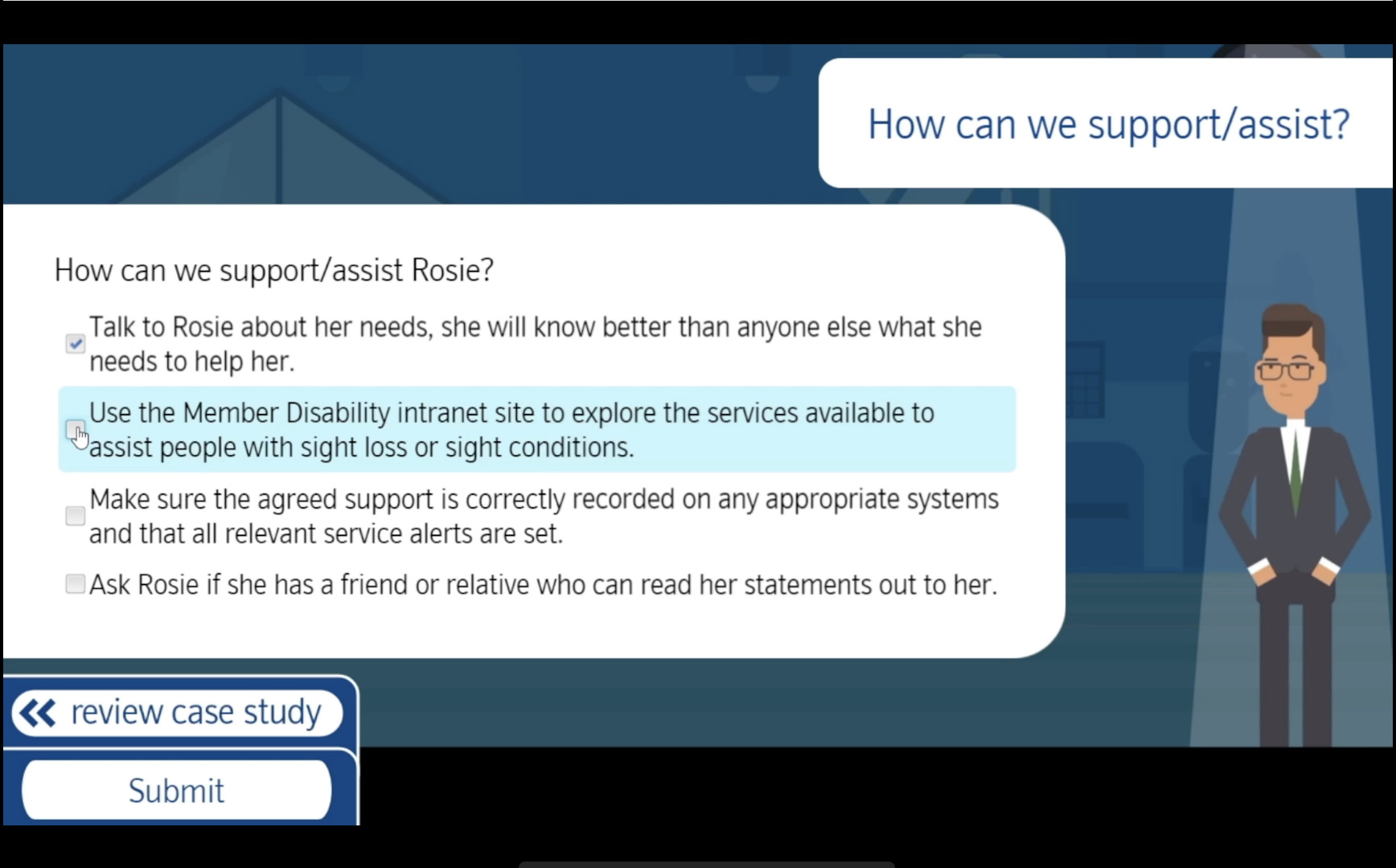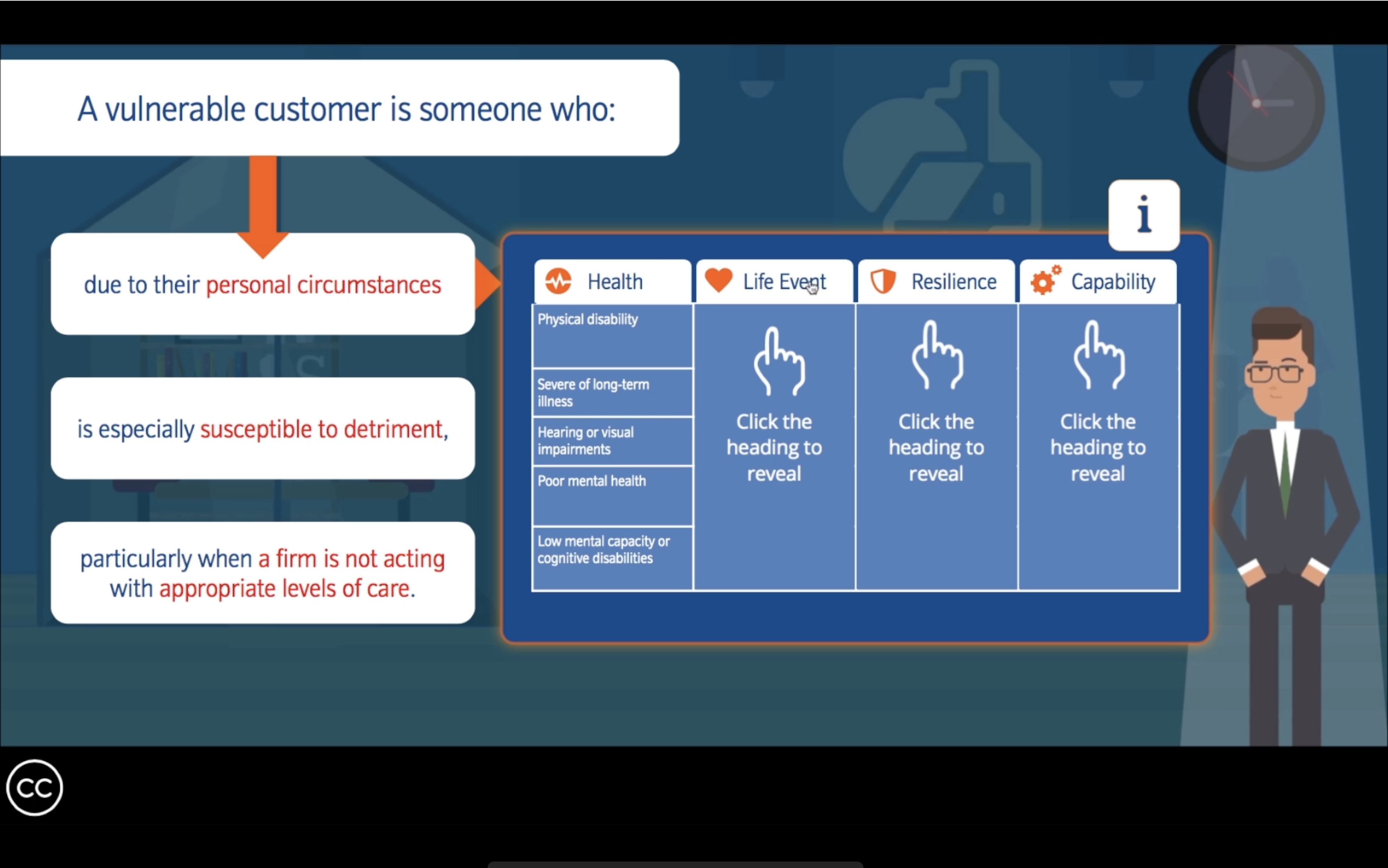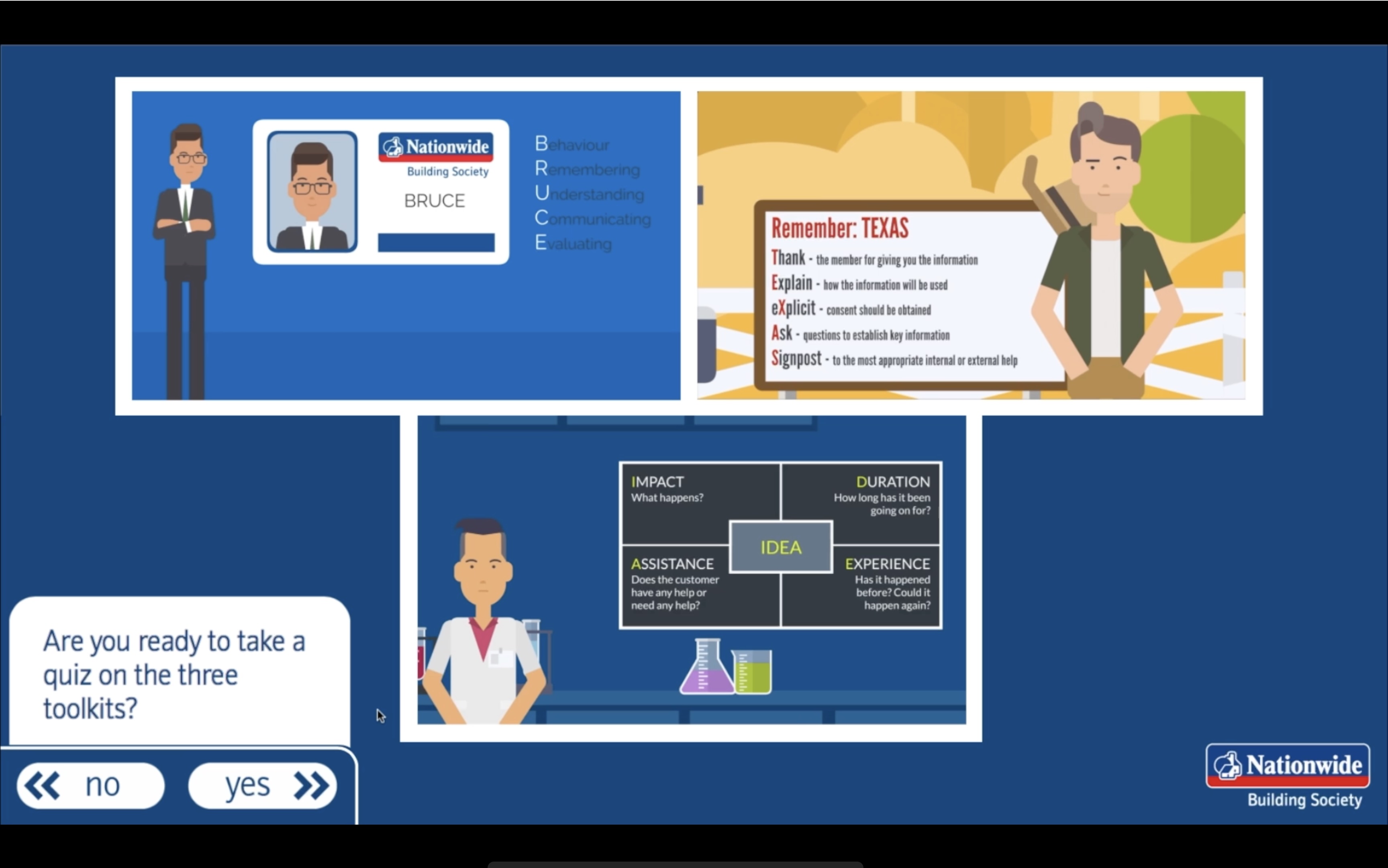 VAI is an important topic within financial services. Vulnerable individuals may face challenges accessing essential services or resources due to their circumstances (or change in circumstances). Ensuring that vulnerable individuals have access to essential services and resources is crucial for their well-being and inclusion. Inclusion goes beyond simple access and aims to create environments where vulnerable individuals feel welcome, respected, and valued. Nationwide Building Society wished to update their VAI training to make it more interactive, engaging and memorable. This training package was one of a set of modules that utilised animation and storytelling techniques to tell the stories of VAI personas, and then engage the learner by getting them to make decisions about what they would do to help the individual. |