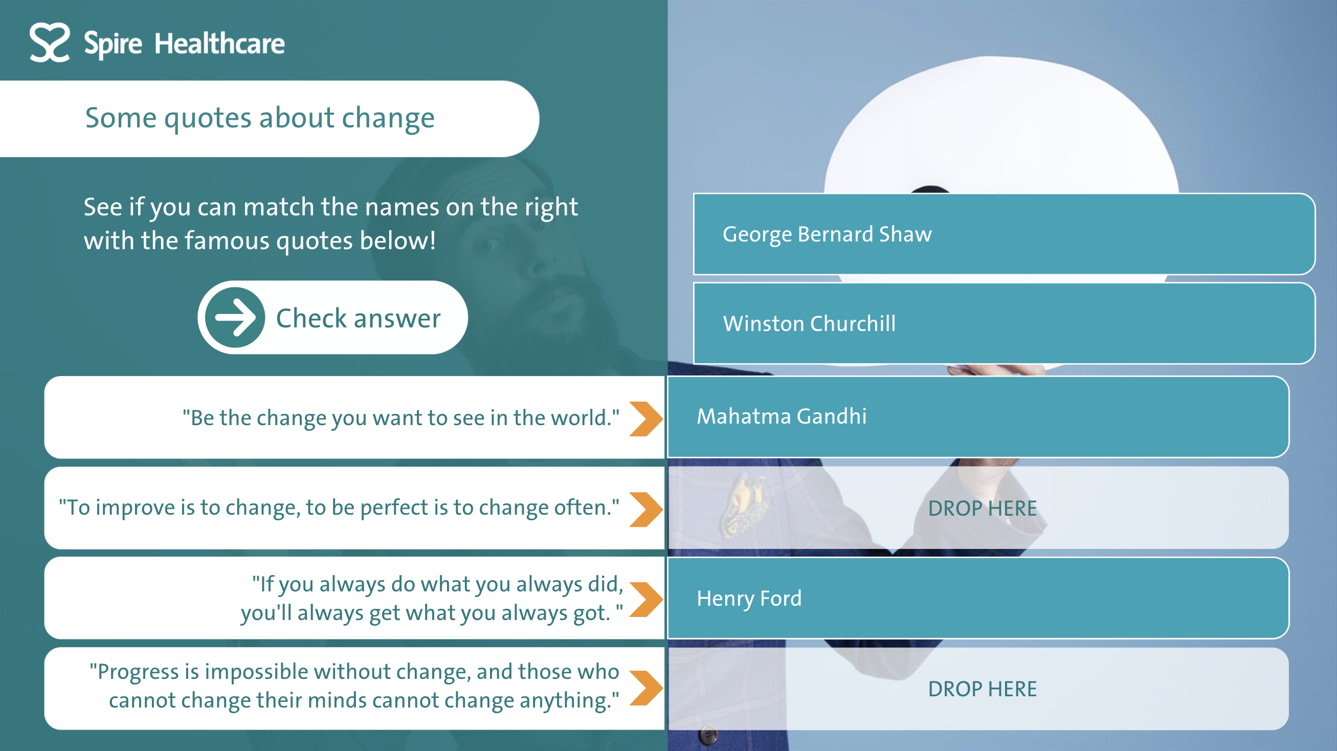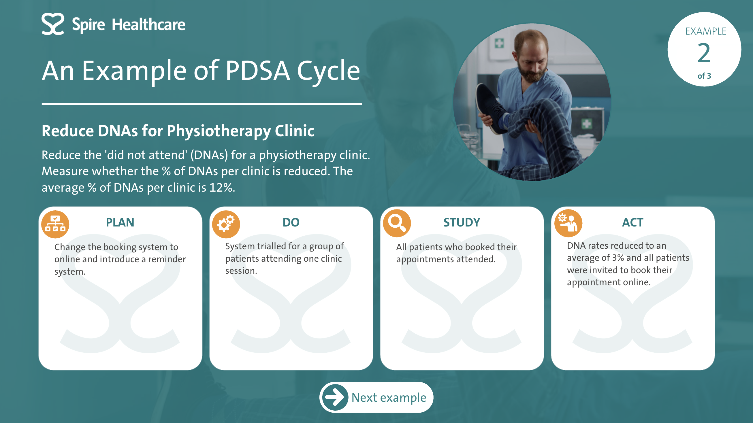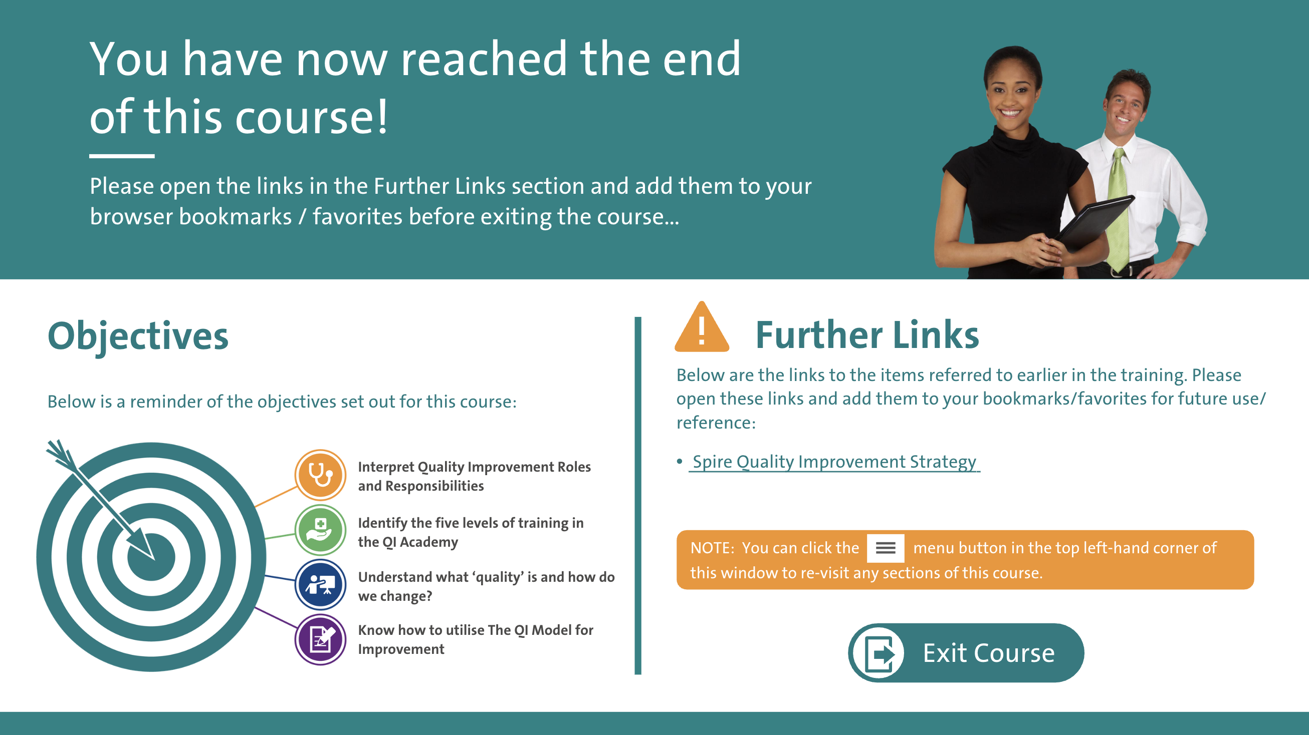 Spire Healthcare have a QI Academy where Quality Improvement is embedded into the organisation through different 'levels' of QI training. This interactive training course is the foundation for the QI Academy and outlines what QI is and how it is implemented at Spire Healthcare. The course utilises different learning styles to maintain user engagement. There are video sections that are presented in a 'documentary style', to make information memorable using storytelling techniques. There are also interactive elements for the learner to engage with on screen, animated explainers and quiz elements to check knowledge throughout. |