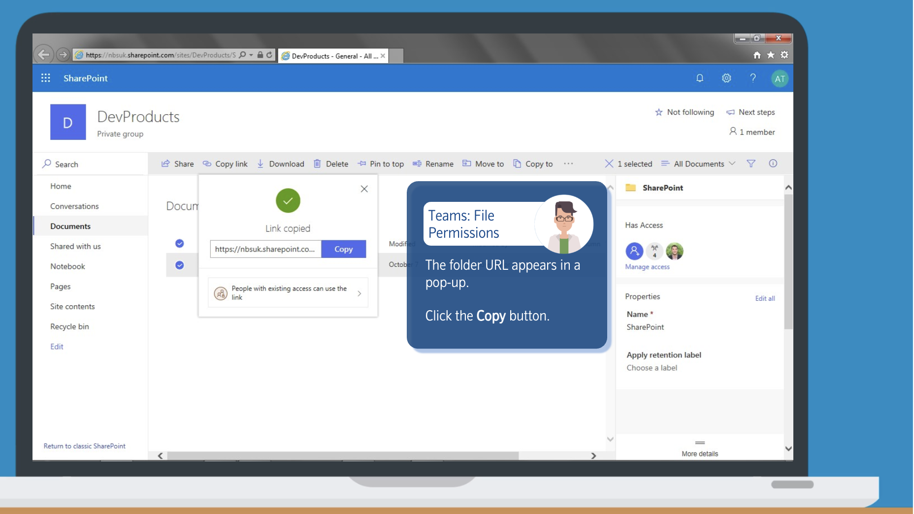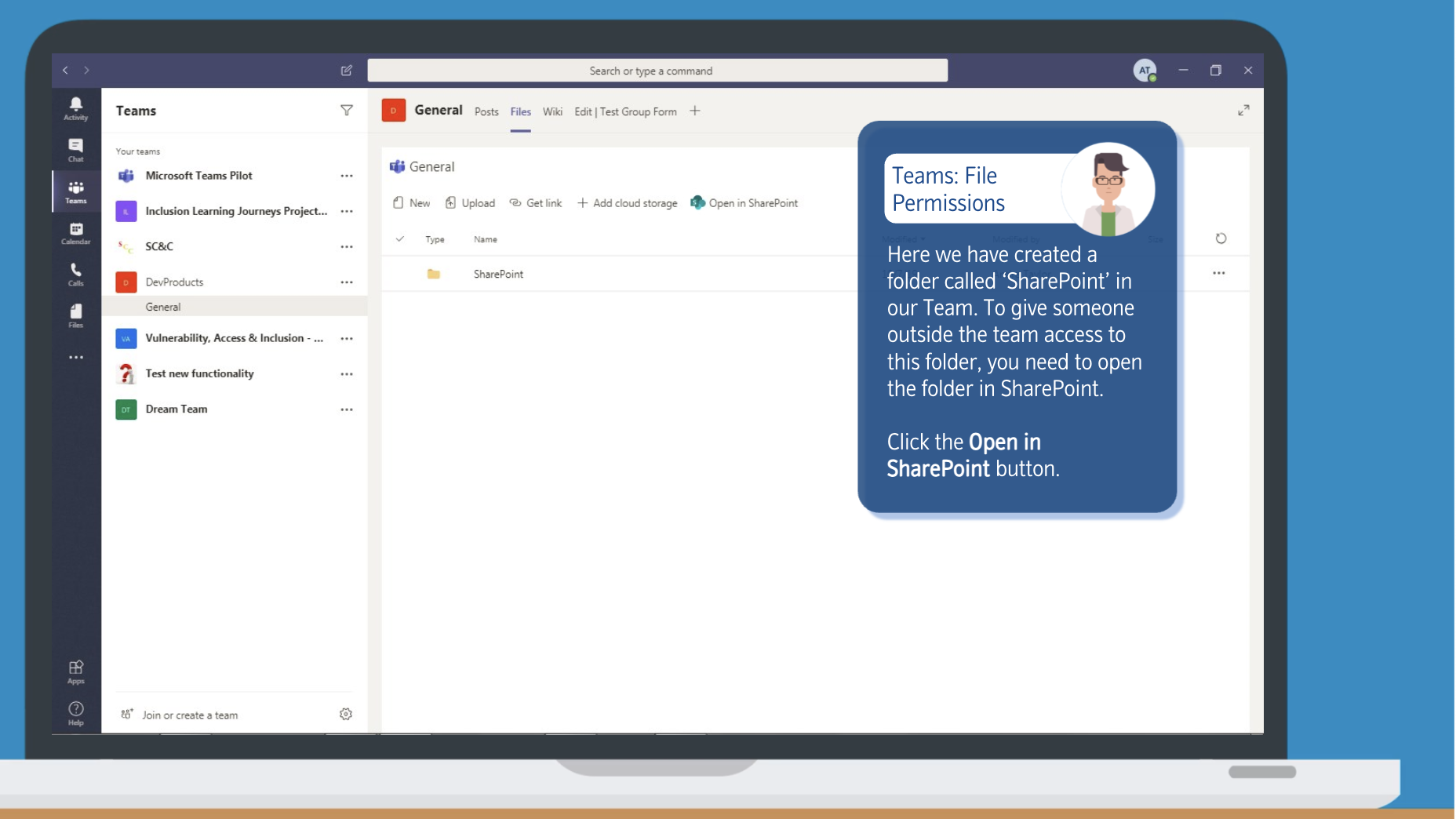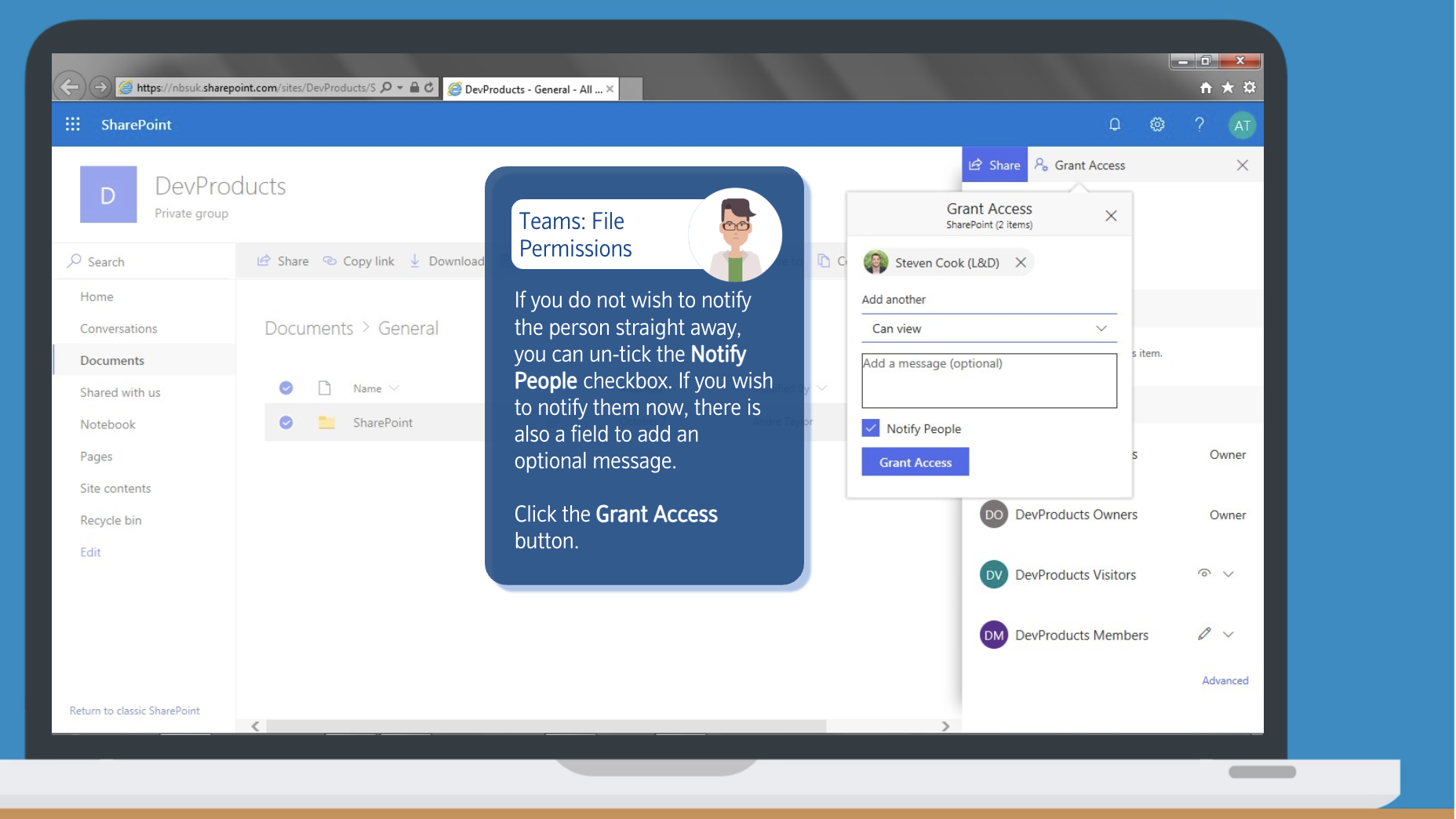 There were numerous 'bite size' simulations and each one covered a different process or procedure within MS Teams. This simulation showed how to grant file permissions.