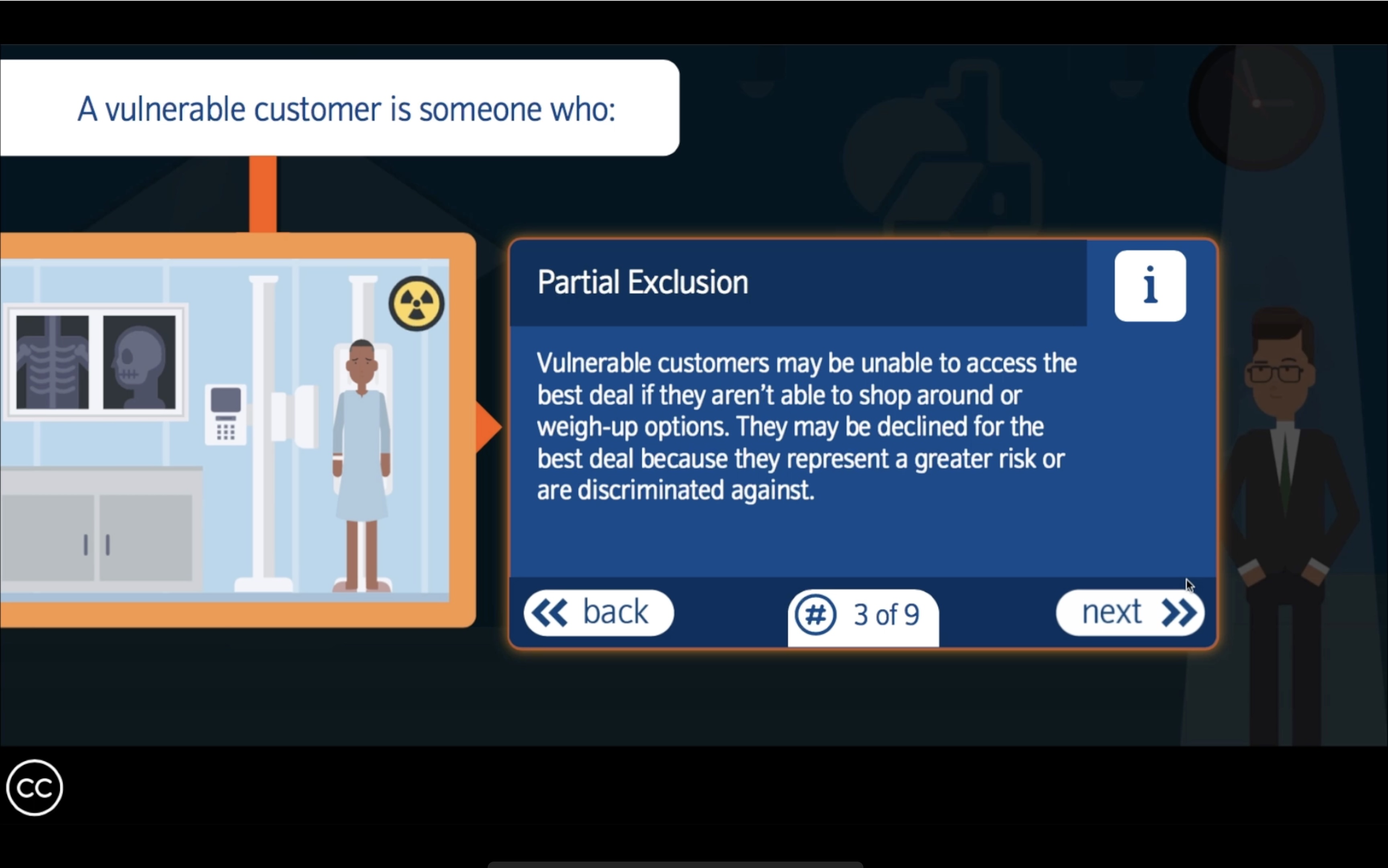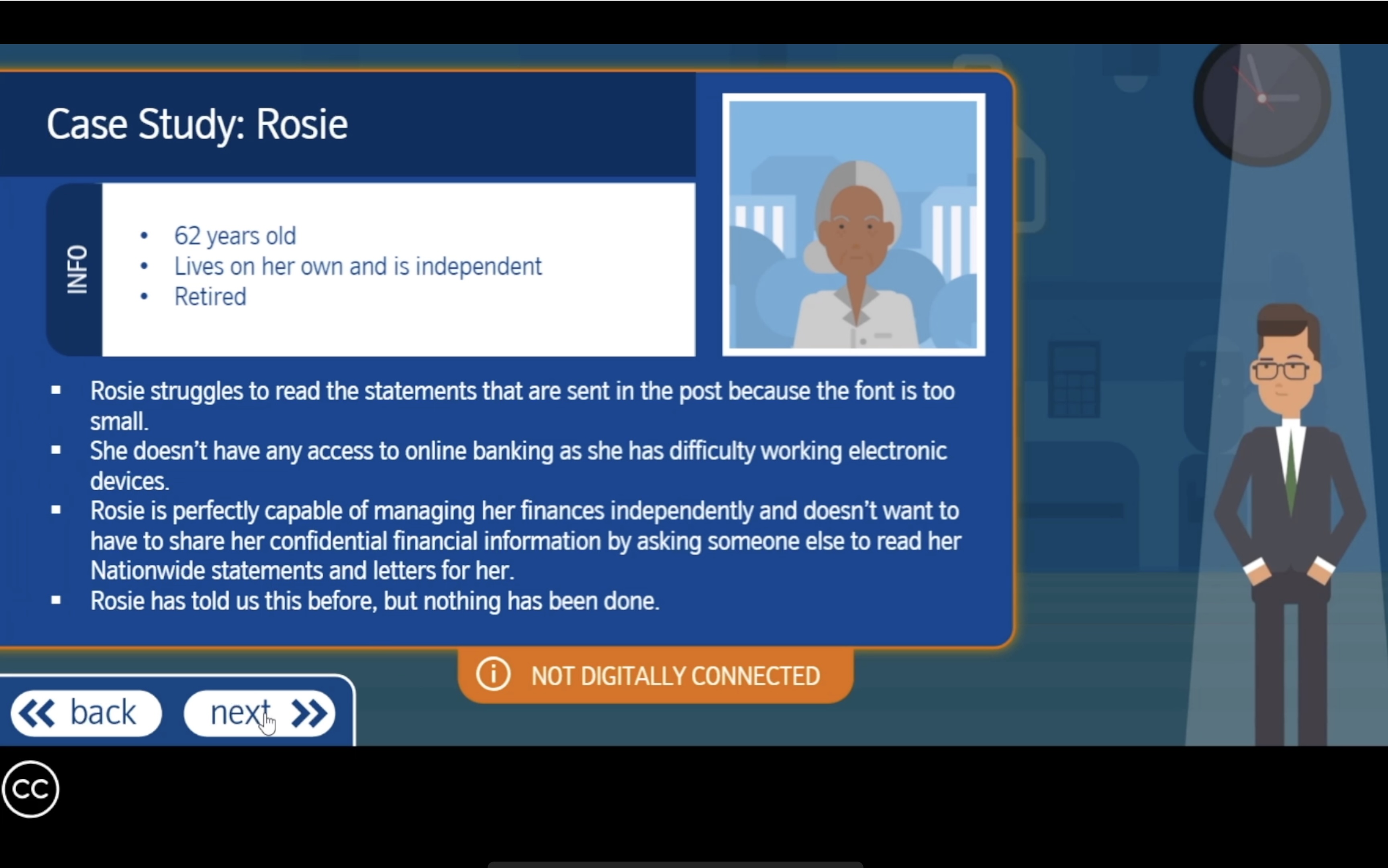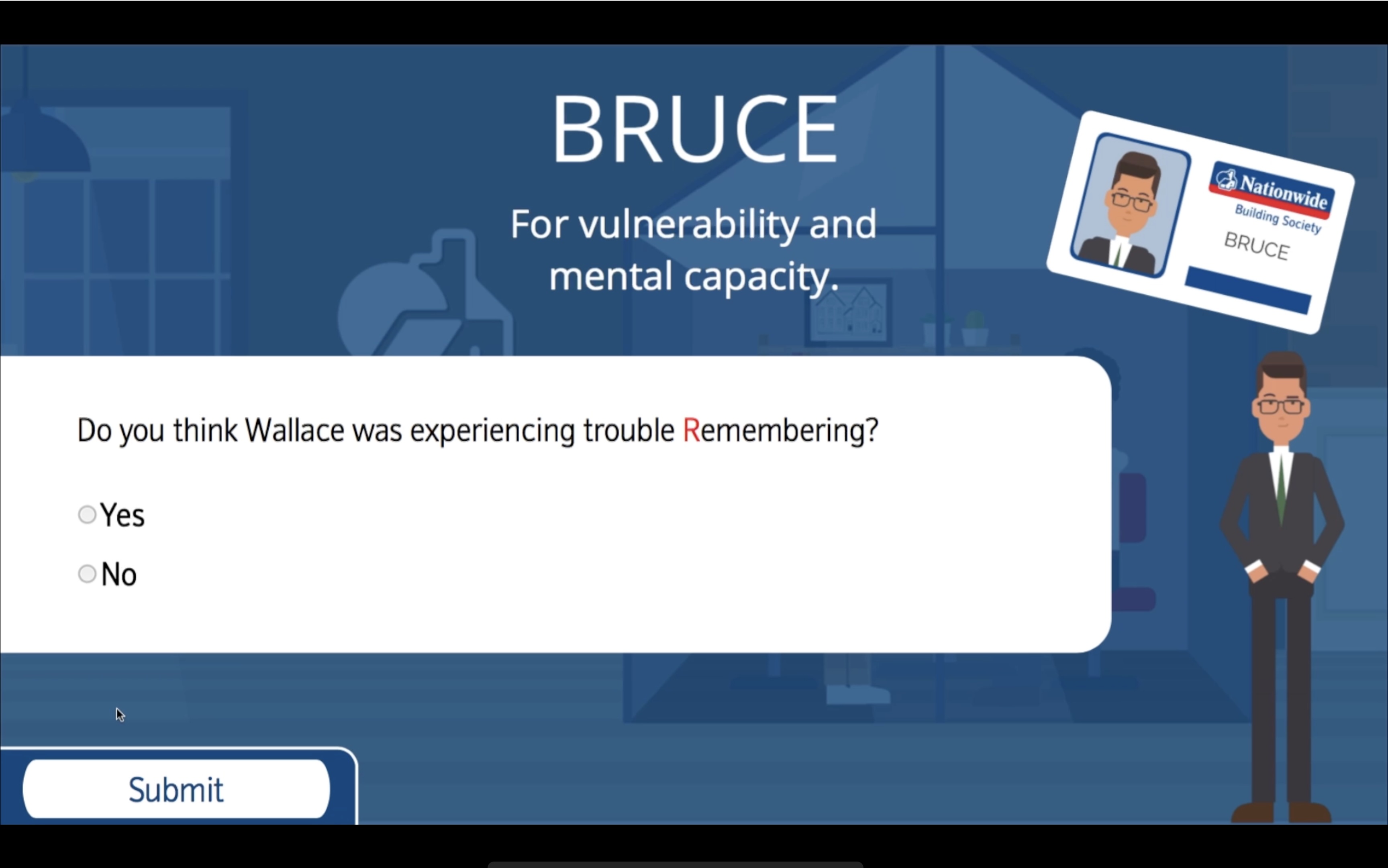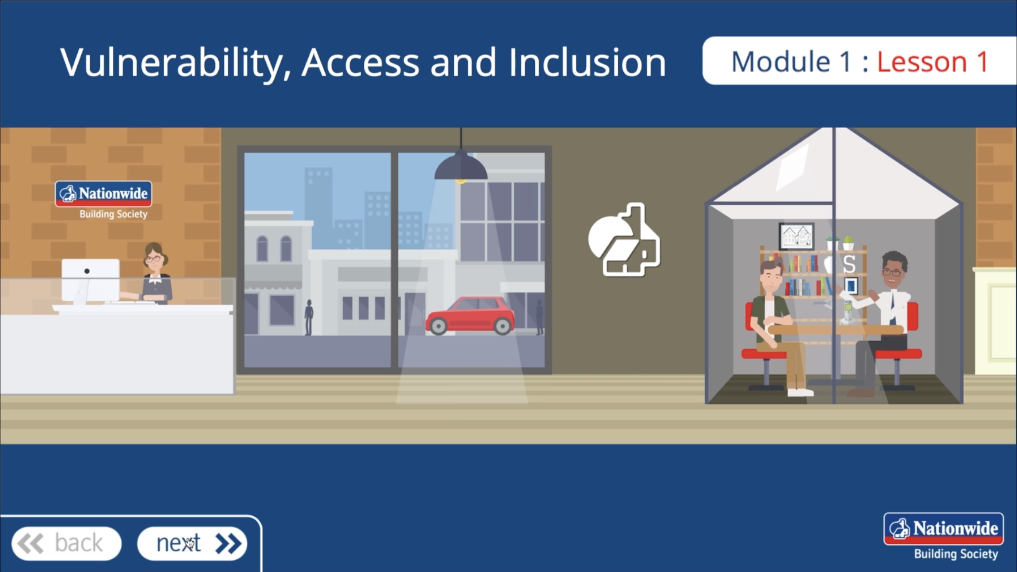 VAI is an important topic within financial services. Vulnerable individuals may face challenges accessing essential services or resources due to their circumstances (or change in circumstances). Ensuring that vulnerable individuals have access to essential services and resources is crucial for their well-being and inclusion. Inclusion goes beyond simple access and aims to create environments where vulnerable individuals feel welcome, respected, and valued. Nationwide Building Society wished to update their VAI training to make it more interactive, engaging and memorable. This training package was one of a set of modules that utilised animation and storytelling techniques to tell the stories of VAI personas, and then engage the learner by getting them to make decisions about what they would do to help the individual. |