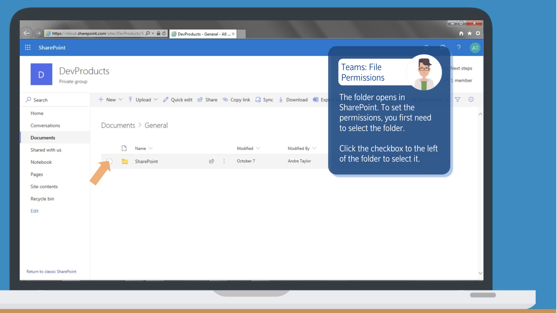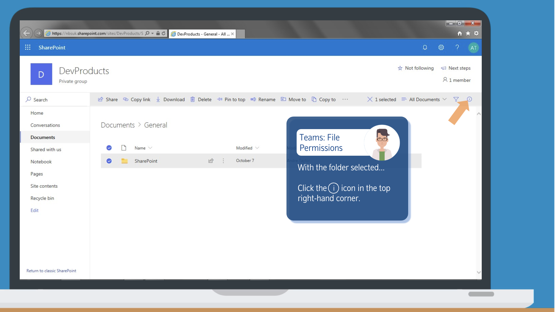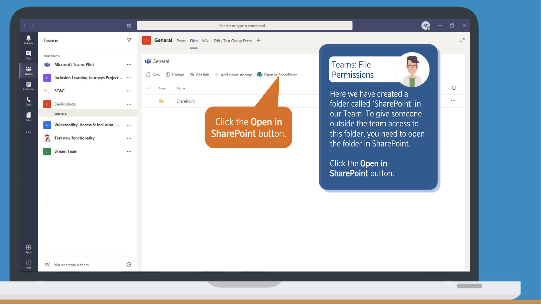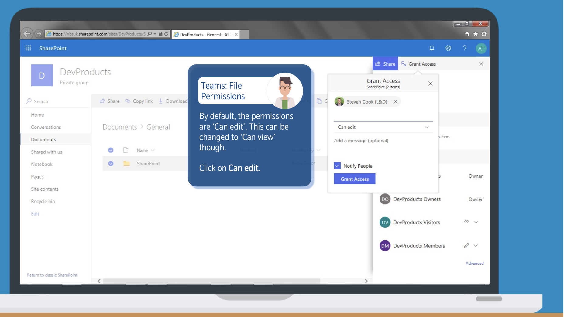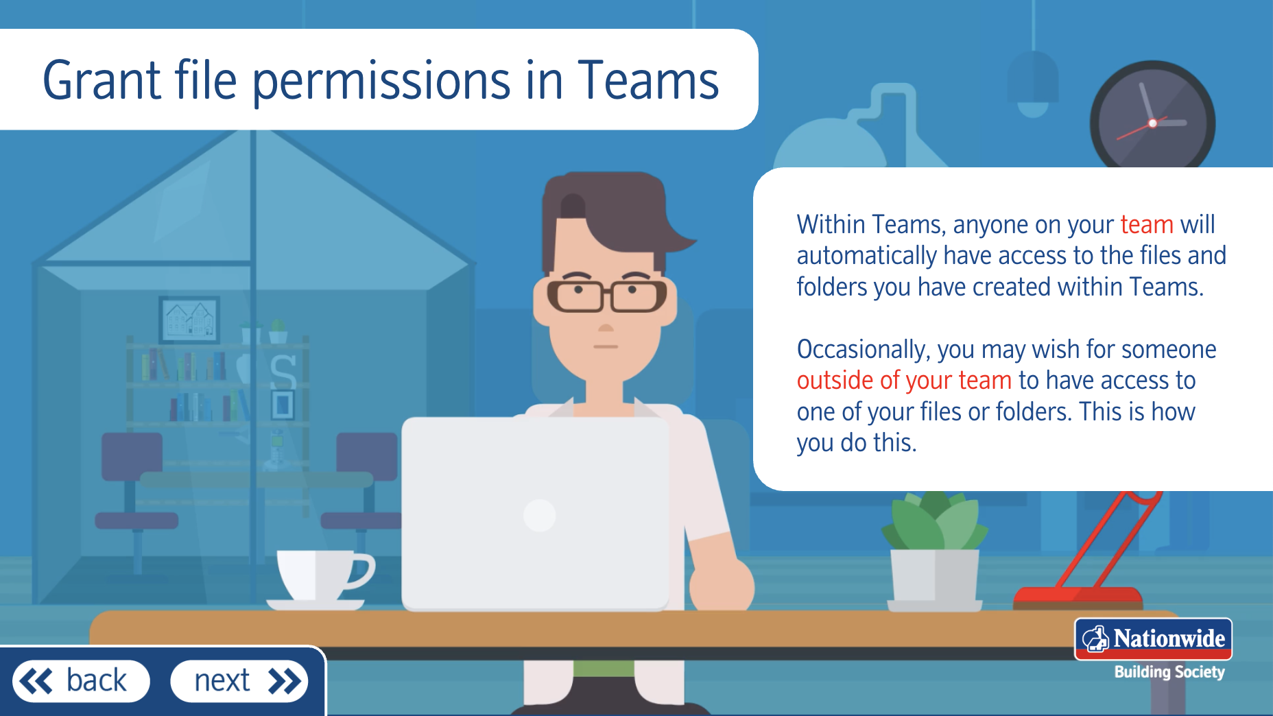 There were numerous 'bite size' simulations and each one covered a different process or procedure within MS Teams. This simulation showed how to grant file permissions.